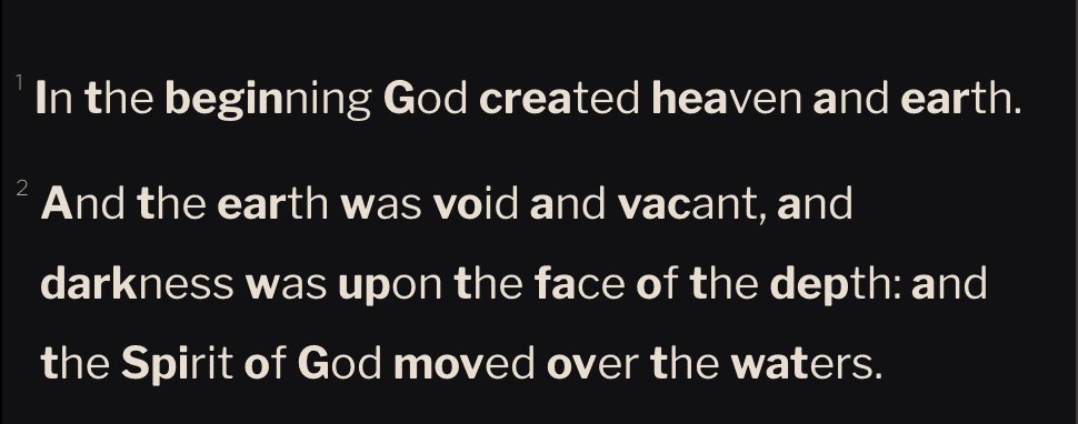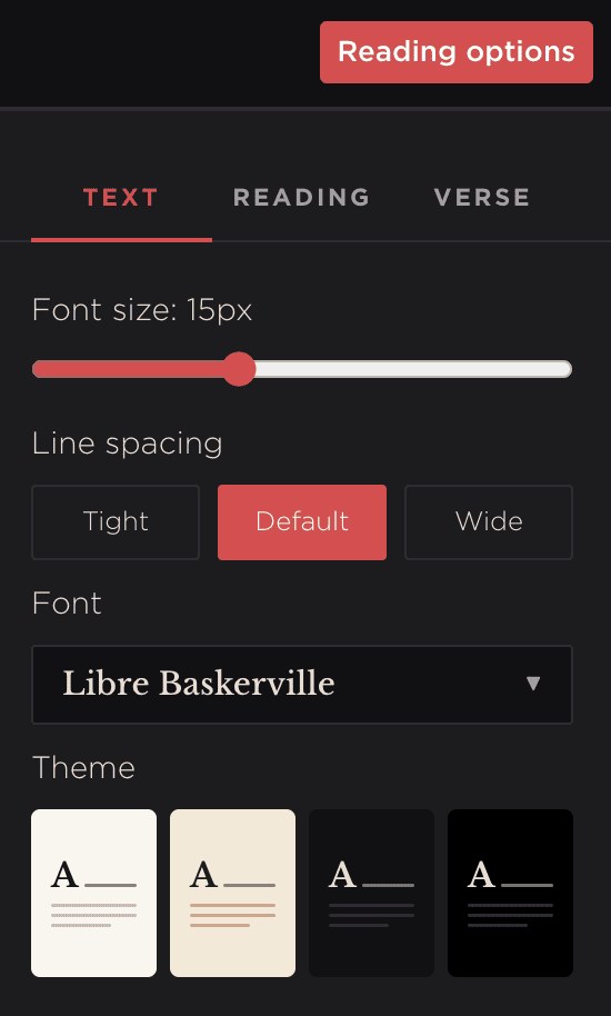 - Paragraph view: Arranges the text in flowing paragraphs rather than numbered lines, as the original printed book appeared. Two sub-options are available: Drop cap renders the first letter of each chapter as a large decorative capital, and Hanging verse numbers pulls each paragraph-opening verse number into the left margin so the text body remains flush throughout.
