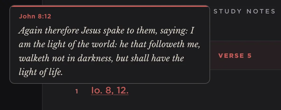 Each entry card can be expanded to reveal inline footnotes and the source reference. The footnotes supply textual variants, parallel passages, and the editor's clarifications. The source line at the foot of each card gives the standard citation for the patristic text: the volume and column in Migne's Patrologia Graeca or Patrologia Latina, or the equivalent critical series. Bible references within the commentary text are linked: hovering over one shows the verse text in a small popover, the same tooltip used in study mode.