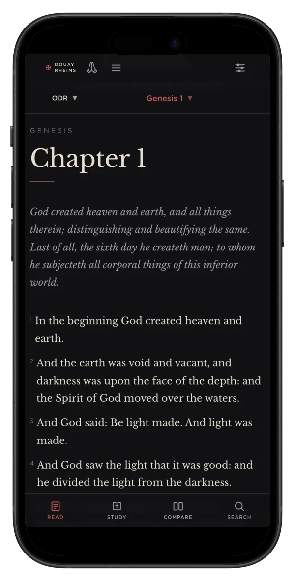 Any chapter can be placed alongside other translations for direct comparison. The most revealing comparison is with Bishop Challoner's revision of the Original Douay-Rheims itself. Setting the two texts side by side shows exactly what Challoner changed: where he simplified a Latinate construction, where he replaced the Original Douay-Rheims' vocabulary with a phrase borrowed from the King James Version, and where he left the original untouched. It is the clearest way to see what the Original Douay-Rheims actually is and what was lost in revision.