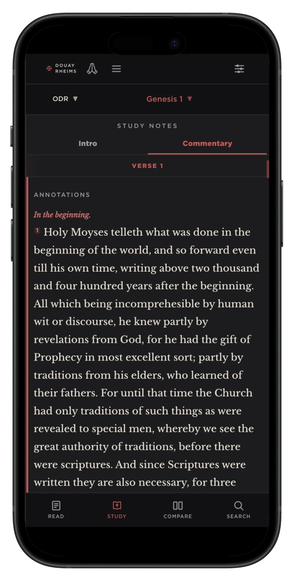 Study mode opens a side panel alongside the text. As you scroll, the panel tracks the current verse and surfaces the notes, commentary, and cross-references that belong to it. All of this material is reproduced exactly as the translators and commentators wrote it. Nothing has been added, removed, or modified.