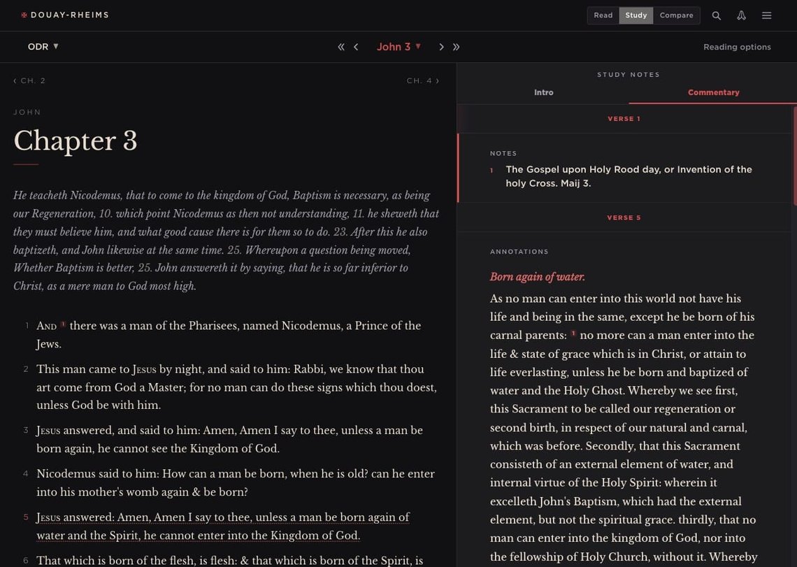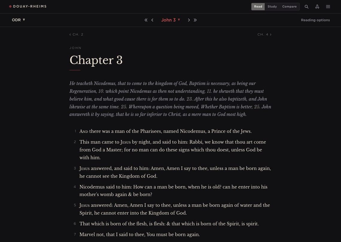 The King James Version is also available. It is relevant here less as a Protestant counterpart than as the source Challoner drew on when modernising the Original Douay-Rheims' English. Reading the three texts together, Original Douay-Rheims alongside Challoner alongside KJV, traces that influence directly. The Revised Standard Version Catholic Edition is planned as a further modern reference.