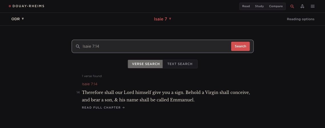 - Verse search examples: Josue 1:9, Isaie 7:14, Jn 3:16. Any reference in DR or modern naming.